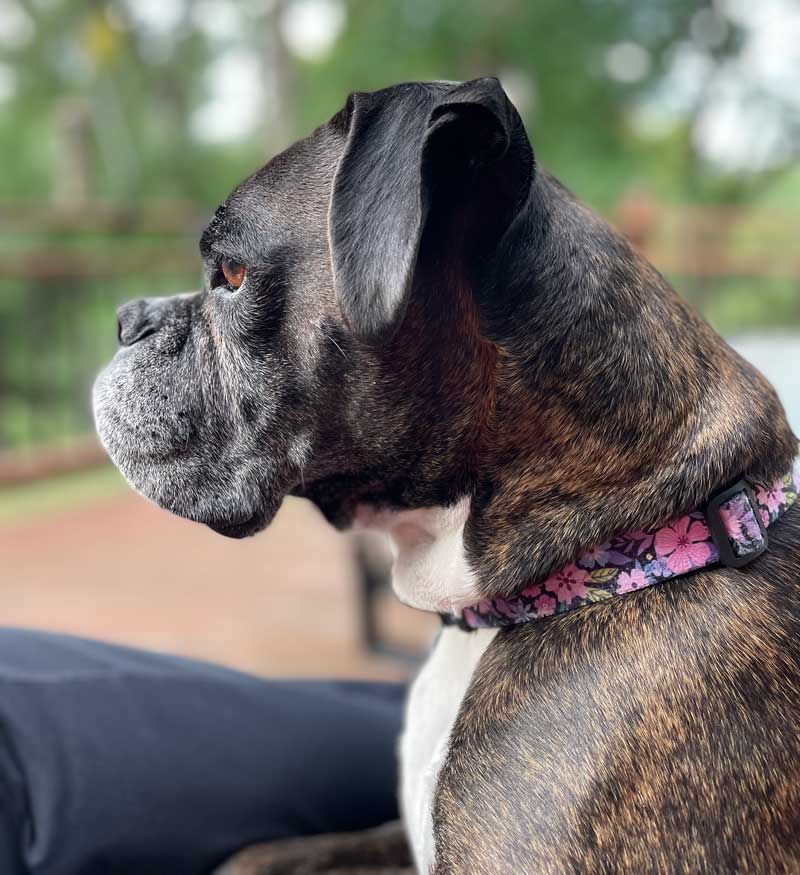 We adopted Layla last summer. She was an 8-year old brindle with a twinkle in her eyes and unbounding energy!! It was love at first sight for all of us! We brought her home to a house full of treats, toys, and a LOT of affection. We spoil her as much as we can, and love every minute of it. It has been fun introducing her to new things. She tilts her head back and forth listening to something new, and we all laugh at her antics. Just because she is 8 years old, don’t think she isn’t frisky!! She gets several walks a day, pup cups on the weekends, plays with neighborhood pups, and keeps busy following us around the house as she is a very curious girl.