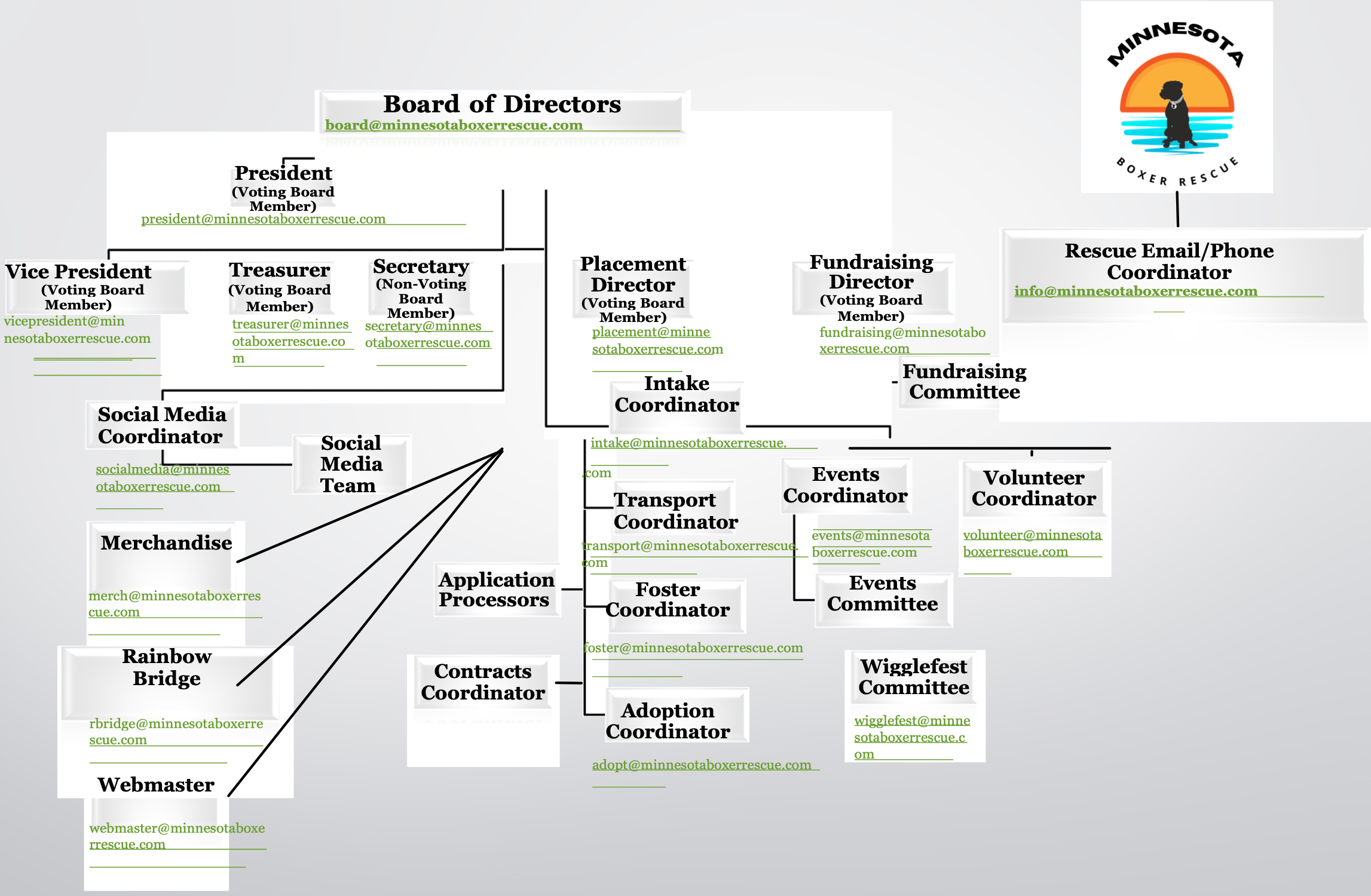 As a nonprofit organization, Minnesota Boxer Rescue (MNBR) depends on its volunteer Board of Directors for guidance and governance. Our Board of Directors creates and reviews policy, provides fiscal oversight, helps raise needed funds, and makes important organizational decisions.